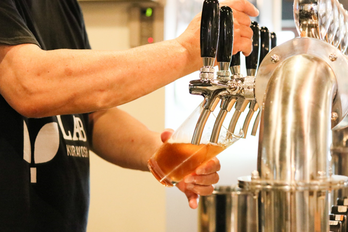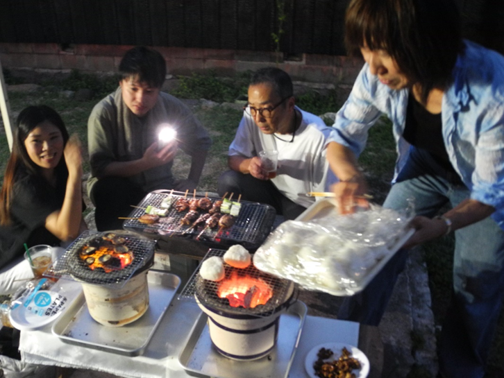会場の「ブリューラボ」の中庭では、同フェスに出店する「焼とりや ちくぜん」(山口)と「今治焼鳥まる屋」(愛媛)の焼き鳥が炭火で焼かれ、出席者らは倉吉ビール社長の福井恒美さんがサーバーで注いだ出来立ての地ビールを満喫していました。