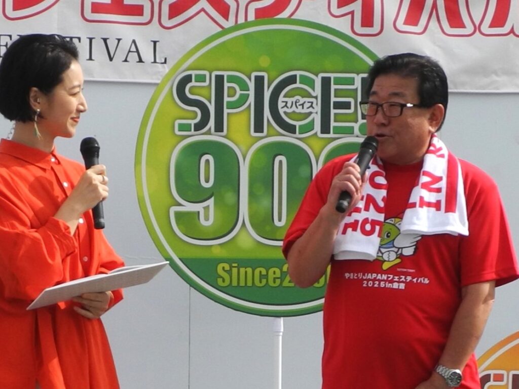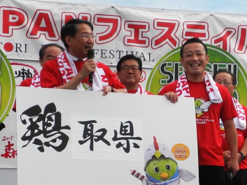 開幕に合わせて、日本海テレビの情報番組「スパイス」の生放送が行われ、ステージに立った広田一恭倉吉市長は「市人口を上回る5万人のお客さんを呼びたい」と決意表明。続いて平井伸治鳥取県知事と森英司実行委員長が「これから鳥取県は、〝鶏取県〟になります!」と笑顔で宣言しました。