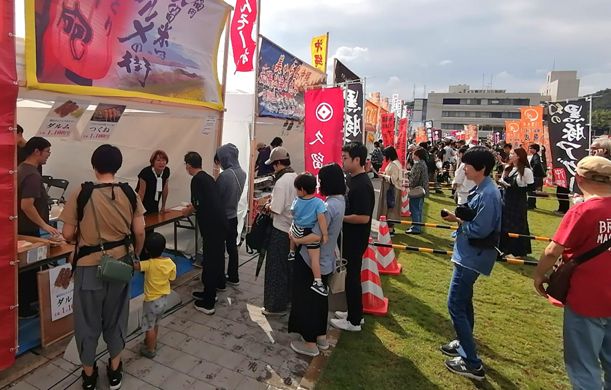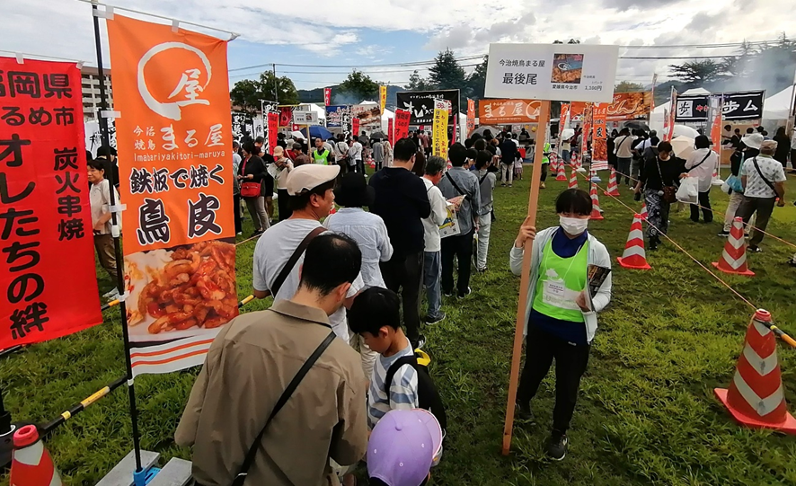 北海道から沖縄まで全国の焼き鳥の名店が鳥取県倉吉市に集結する「やきとりJAPANフェスティバル2025in倉吉」が27日(土)ついに開幕しました。会場となった倉吉市駄経寺町の県立美術館横、大御堂廃寺跡歴史公園芝生広場は焼き鳥を焼く煙がモウモウと立ち込め、美味しいにおいに誘われて、どの屋台も長蛇の列。巨大なフードコート・テントでは、ステージイベントを楽しみながらお目当ての焼き鳥を楽しむ家族連れの姿が見られました。
