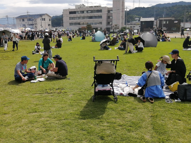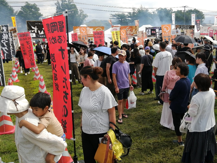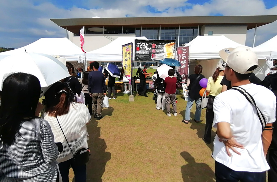 会場となった鳥取県倉吉市駄経寺町の大御堂廃寺跡歴史公園芝生広場は前日に続き、屋台の前に長い行列が並び、あたりは焼く煙で真っ白。今春オープンした県立美術館周辺はかつてない人出でにぎわい、地元の活性化に大きく貢献しました。