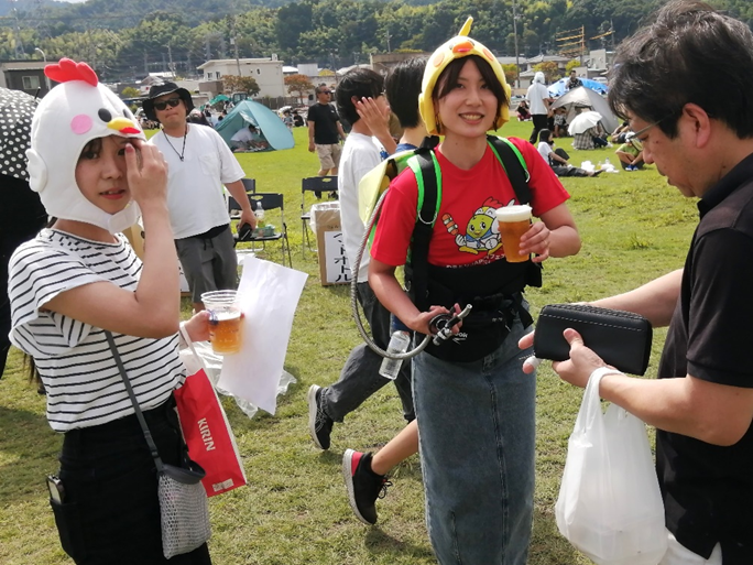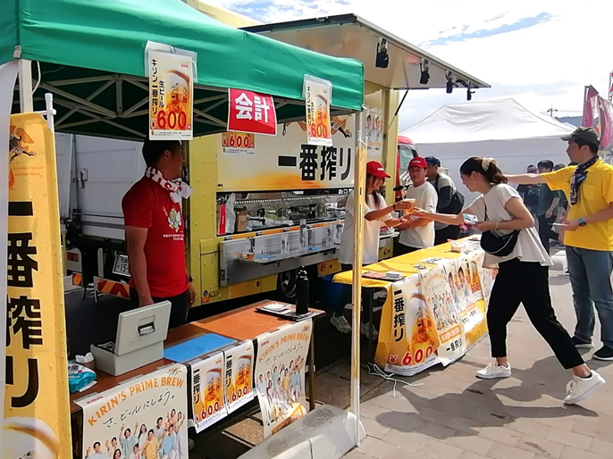 2日目は夏を思わせる強い日差しが照りつけ、会場では焼き鳥を片手にビールを楽しむ姿を多く見かけました。キリンビールの創業者のひとりが倉吉市出身の磯野長蔵氏(市名誉市民第1号)であることから、ビール原料の国産枠として、キリンの「一番搾り」に倉吉市の上北条地区で栽培されたビール麦が使用されています。会場にはその「一番搾り」のビールを満載したトラックが横付け。東京ドームさながらビールサーバーを背負った女性たちが、会場内で冷たいビールを売り歩いていました。
