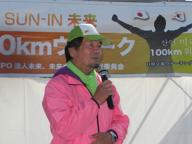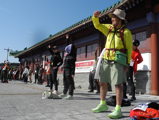 「中国庭園燕趙園」前での出発式では、主催の認定NPO法人未来、岸田寛昭理事長が「気持ちの良い天気に恵まれました、コースは、このたび映画化された谷口ジローさんの『遥かな町へ』の舞台となった倉吉の町並み、名探偵コナンのふるさと・北栄町、そしてNHK朝ドラ『ばけばけ』の小泉八雲が歩いた琴浦町など、物語に富んだコース。世界に誇れるコースだと思います。風景を楽しみながら完歩を目指して下さい」とあいさつ。中国庭園にちだんで銅鑼(ドラ)を合図に元気よくスタートしました。