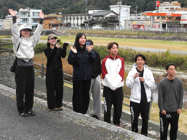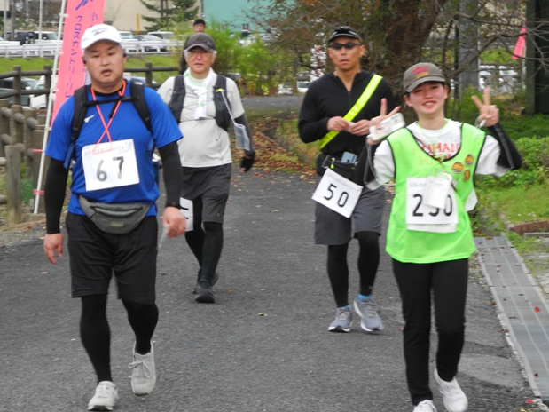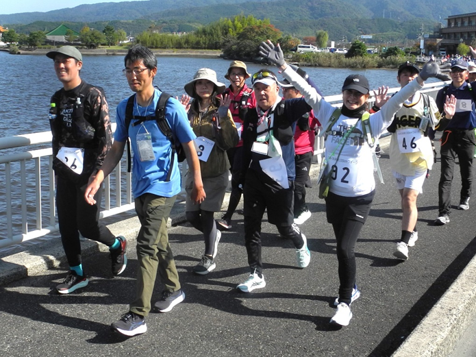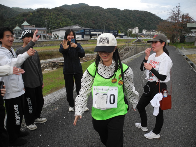 おや、第1チェックポイント付近の河川敷で、学生たちが何やら人待ち顔です。「おーい、こっちだよ」。手を振るのは、ゼッケンを引き継ぐ次のウオーカー。団体で2チーム参加の近畿大学の学生たちです。「21㌔もよく歩いたね」「次は33㌔、もうがんばるしかない」と和気あいあいの雰囲気。100㌔ウオークは、個人の「自己への挑戦」もありますが、団体の「チームのきずな」が味わえる場でもあります。