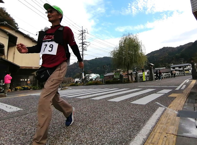湯梨浜町から三朝町に抜ける波関峠(なんぜきとおげ)は前半の難所。登りが延々と続き、ようやくピークに到達すると町の境界線。ここから三朝温泉を眼下に眺めながら下っていきます。三徳川沿いに建ち並ぶ温泉街を抜けて、「三朝温泉ふるさと健康むら」が最初のチェック・ポイント。でも、ここは21・7㌔地点、まだほんの「序の口」です。
