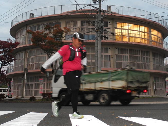 いよいよ倉吉の市街地に入ってきました。ここは鳥取市出身の漫画家、谷口ジローさんの『遥かな町へ』の映画化の舞台になった町(来年公開予定)。でも、車の交通量も増え、今春オープンしたばかりの鳥取県立美術館や梨ミュージアムの建物も見えてきましたが、ゆっくり眺める余裕はありません。円形劇場とっとりフィギュアミュージアムを通過する頃には車のヘッドライトも灯り、すっかり夜の帳(とばり)が参加者の姿を包み込みました。