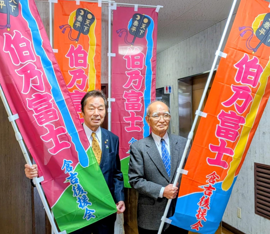 大相撲初場所(来年1月11日初日、両国国技館)から、鳥取県倉吉市出身の「伯桜鵬」が「伯乃富士(はくのふじ)」(西前頭3枚目、伊勢ケ浜部屋、本名・落合哲也)に改名するのを受け、倉吉後援会(会長・広田一恭倉吉市長)では応援ののぼり旗を急きょ新調、伯乃富士関の出身地、同市成徳地区に「これからもしっかり応援を」と50枚ののぼり旗を贈りました。