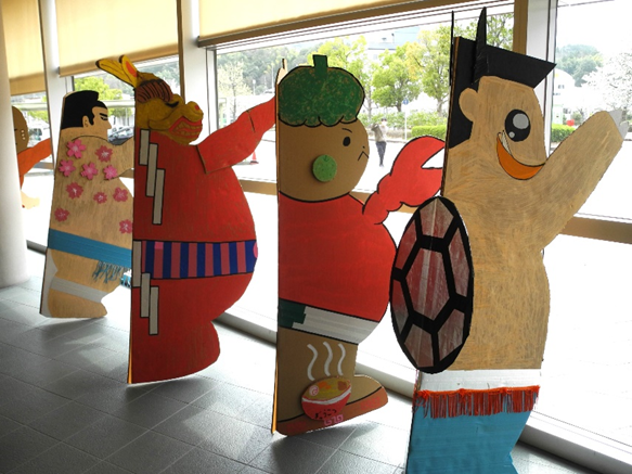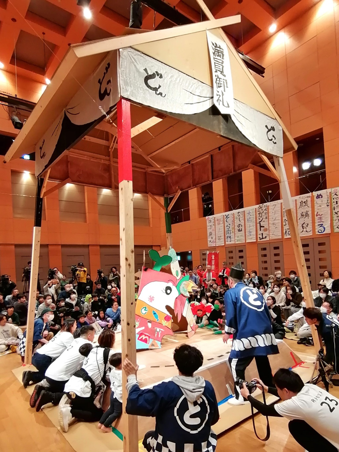 1昨年3月、県立美術館の1年前カウントダウン・イベントとして、県内から集まった商店街や職場、家族など32チームが戦いを繰り広げた「どんどこ!巨大紙相撲大会~とっとりけんび場所」。全国で参加型アートプロジェクトを展開しているKOSUGE1-16代表の土谷享さんの企画によるものです。佐渡ヶ嶽部屋を応援する鳥取県桜友会と伯桜鵬(現伯乃富士)の倉吉後援会が後援、三和段ボール工業協賛。