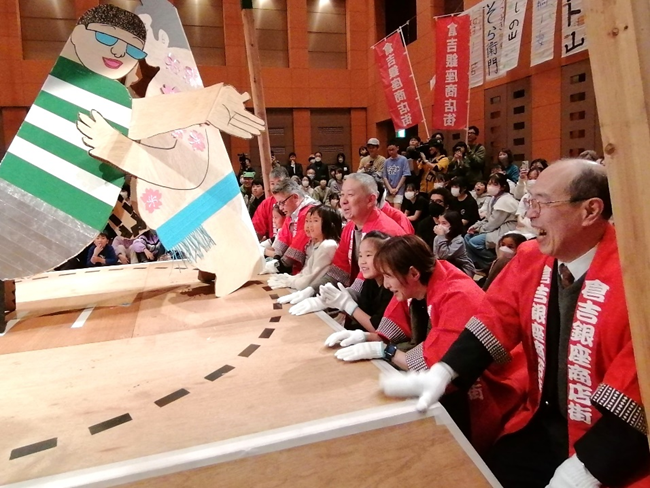 鳥取県立美術館(鳥取県倉吉市駄経寺町2丁目)のオープン1周年を記念して、アート&相撲の町・倉吉に、あの「どんどこ!巨大紙相撲」が2年ぶりに帰ってきます。会場は同美術館ひろま。開催は3月29日(日)午後1時から。段ボールでつくった等身大力士たちが繰り広げる白熱の取り組み、主催する同美術館では参加チームを募集中です。