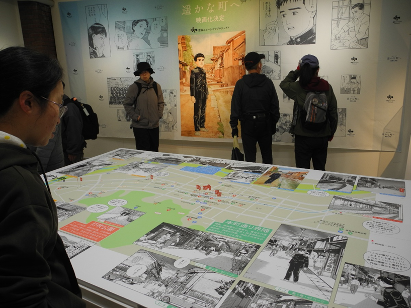 この特別展は「谷口ジロー展『遥かな町へ」・映画『遥かな町へ」ロケ写真展」(鳥取県、倉吉市、円形劇場など主催)。ヨーロッパで数々の漫画賞を受賞し、海外で今も人気の高い谷口ジローさん(故人)の描いた『遥かな町へ』の原画の数々や、昨年9月に同市内で行われたロケの場所を示した大型マップや撮影風景の写真などが展示されています。