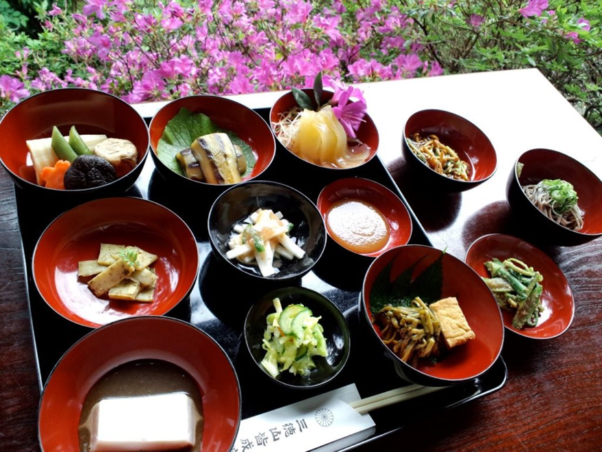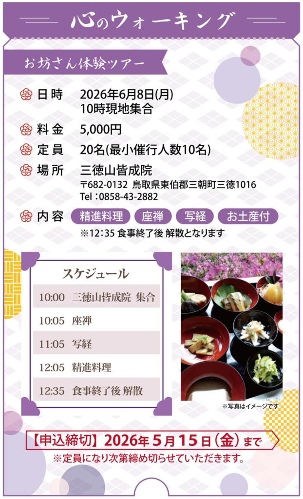 「せっかくウオーク」とは…山岳修験道の本場、日本遺産・三徳山のご住職から食事のありがたさや「心」のお話を聞き、手作りの自家製ゴマ豆腐をはじめ、地元の野菜を使った精進料理を堪能いただけます。座禅では、心を静め、呼吸法を学びます。その後は、願いを込めながら「般若心経」を写経していただきます。お子様には「写佛」もあります。