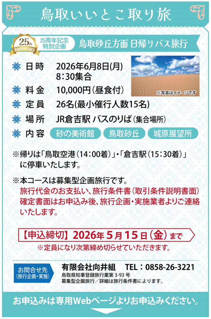 風を感じながら、海あり山あり、自然と歴史に富んだ鳥取県中部を歩く「第25回SUN-IN未来ウオーク」(主催・認定NPO法人未来)は6月6日(土)7日(日)に倉吉パークスクエア(倉吉市駄経寺町)を主を会場に開かれます(雨天決行)。