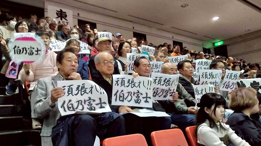 大阪場所7日目の14日に会場のエディオンアリーナ大阪(大阪府立体育会館、大阪市浪速区)を訪れた一行は、この日がちょうど2日目から休場していた伯乃富士が復帰したとあって、すかさず「がんばれ伯乃富士」の応援タオルを掲げ、観客席から大声援。伯乃富士は阿武剋(阿武松)に快勝し、復帰戦を飾りました。ふるさとの応援団の姿はNHKの中継でも大きく映りました。