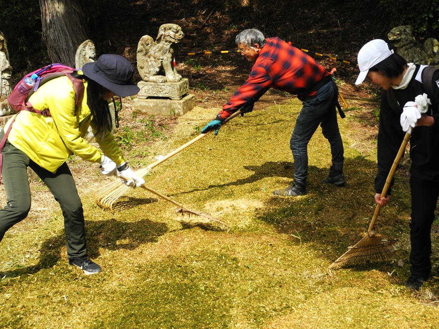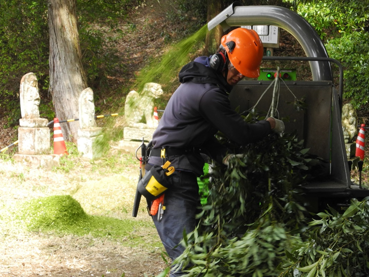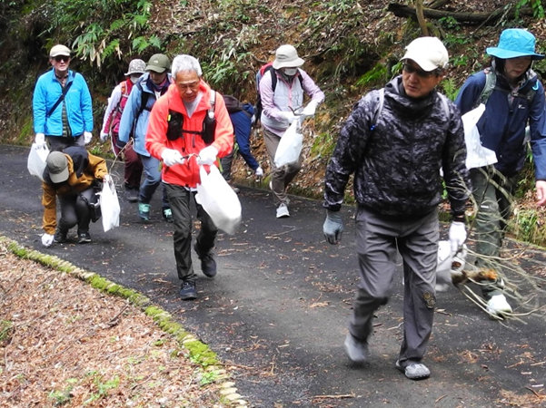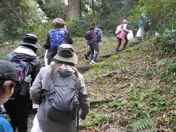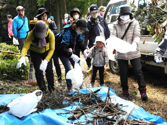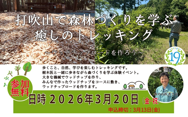 鳥取県倉吉市のシンボル・打吹山(標高204㍍)で、トレッキングを楽しみながらウッドチップ用の木切れなどを集め、中腹にある「越中丸跡」で実際にウッドチップロードづくりに挑戦するイベントが行われ、市内外から50人が参加しました。
