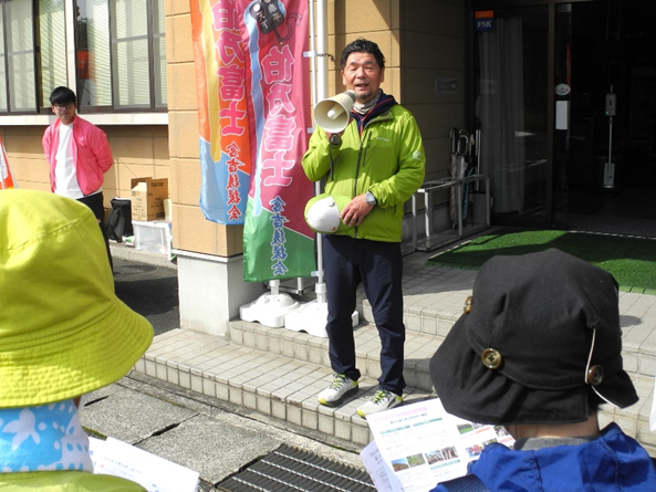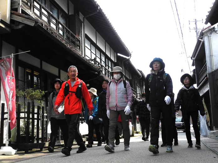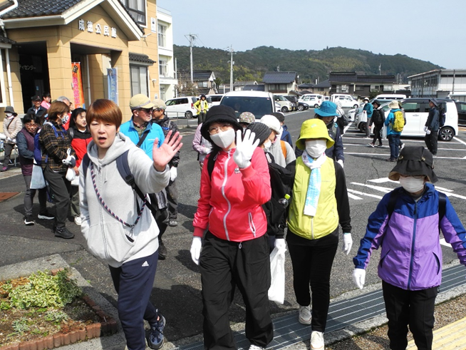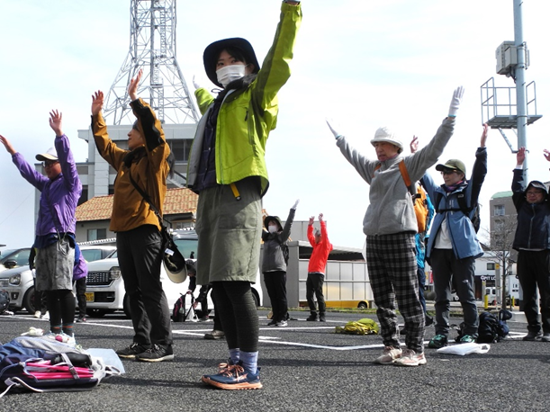 県の「豊かな森づくり協働税」を活用した事業。成徳コミュニティーセンターで行われた出発式では、主催の認定NPO法人未来(同市東仲町)の岸田寛昭理事長が「歩きながら、自然のしくみや活用法を学ぶ取り組みです」とあいさつ、準備体操で体をほぐしたあと、赤瓦の町並みが残る市街地を歩いて、 「全国桜の名所100選」で選ばれている打吹公園を目指しました。