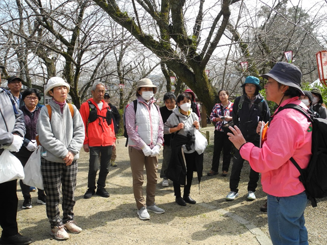 桜の開花の標準木がある打吹公園に到着すると、樹木医の阿部香織さん(山陰緑化建設)が「花見の人出で踏み固められるので、桜は昔から土手道などに植えられてきましたが、根元が固まると栄養が入ってこなくなり、樹勢が弱る原因になります」と解説。このあと木切れを拾いながら、打吹山中腹にある越中丸跡を目指してトレッキングを楽しみました。