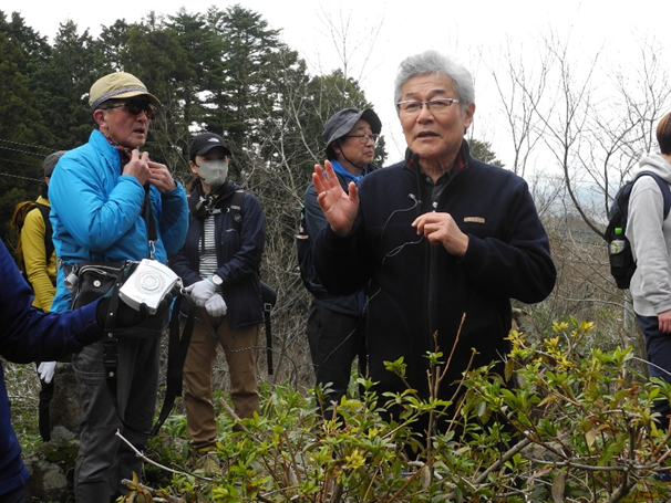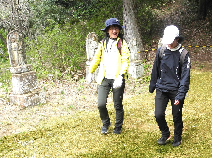 打吹山の西方尾根にある越中丸では、阿部さんが「ウッドチップを敷き詰めた歩道は、雑草の抑制や環境保全、森の木々のリサイクル、歩行の衝撃吸収など、さまざまな効果があります」と説明。また倉吉博物館の根鈴輝雄館長は、かつて打吹城の三の丸として築かれ、西国霊場三十三ヵ所や四国霊場.八十八ヵ所の石仏群が並ぶ越中丸の歴史を解説しました。