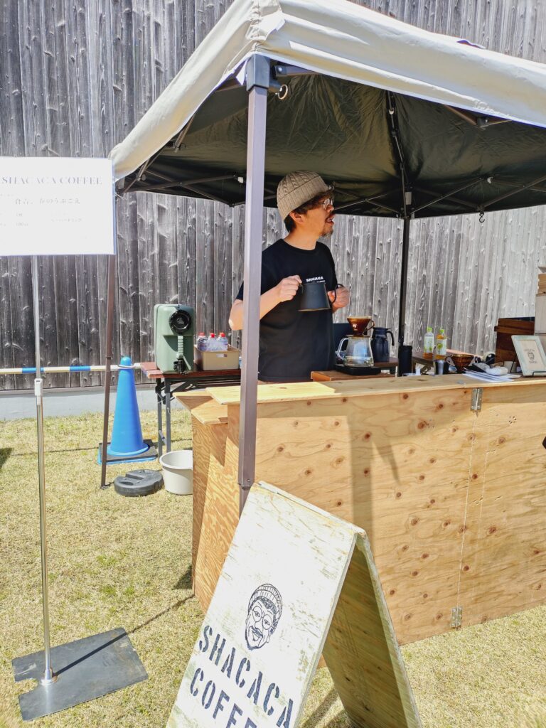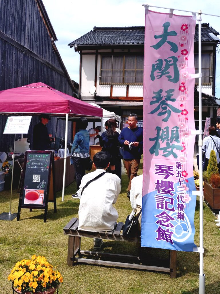 このうち同市魚町にある昭和の名横綱・琴櫻(元佐渡ヶ嶽親方)を顕彰する施設「琴櫻記念館」の前では、2店舗配置され赤いテント(道路側)が岐阜県の「ライトローストコーヒー専門店 紅緋」と京都府の「SHACACA COFFEE」のテントで出店。同記念館の前にある石谷精華堂赤瓦店の「打吹公園だんご」に合うコーヒーを提供していました。